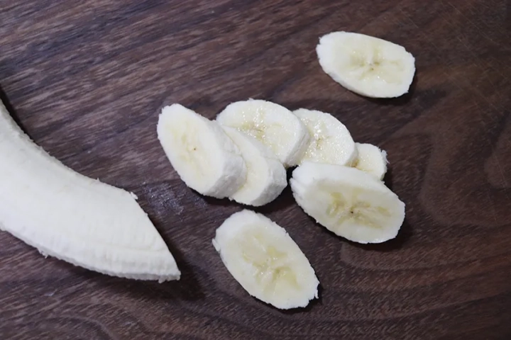 바나나는 적당한 두께로 어슷하게 썰어주세요.