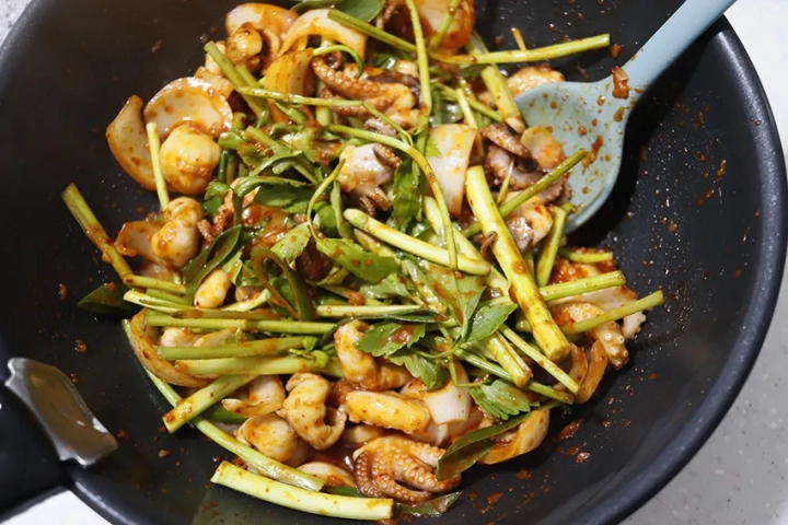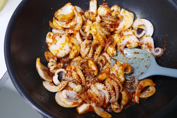 불에서 볶으면 물이 생기고 쭈꾸미가 질겨져요.