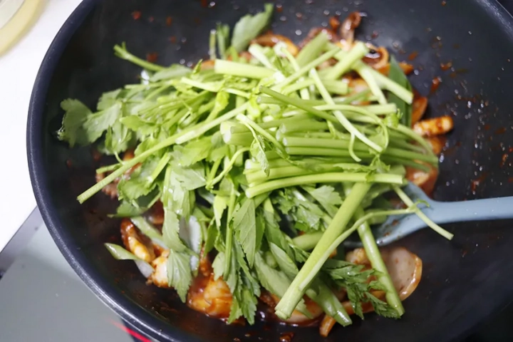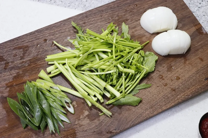 대파는 어슷하게 썰고 미나리는 길쭉하게 썰어주고