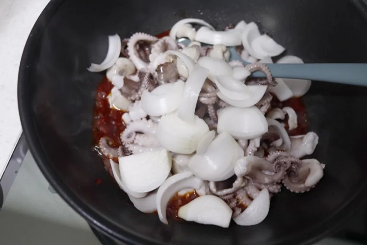 양념이 바글바글 끓어오르면 쭈꾸미와 양파를 넣고 볶아주세요.