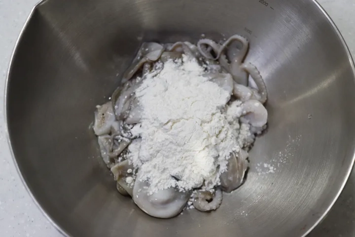 깨끗하게 손질한 쭈꾸미에 밀가루를 더해