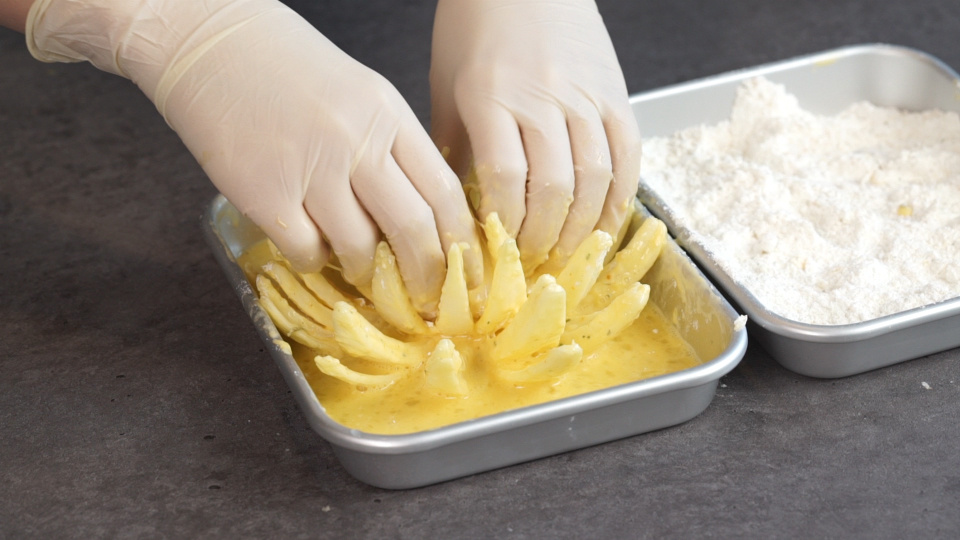 양파를 튀김가루, 계란물 순으로 2번 꼼꼼히 묻혀주세요.