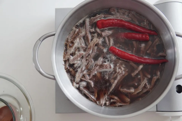 푹 삶은 고기는 한김 식힌 후 결대로 찢어주고