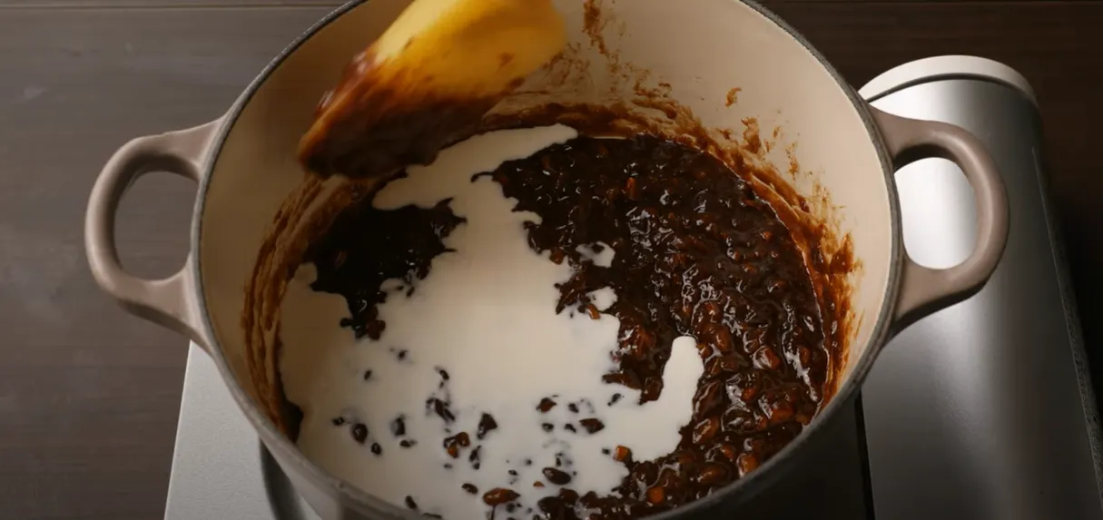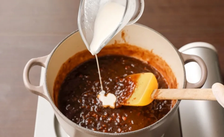 설탕 덩어리가 없어지면 생크림 250g을 부어주세요.