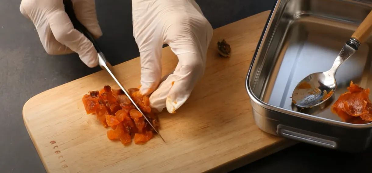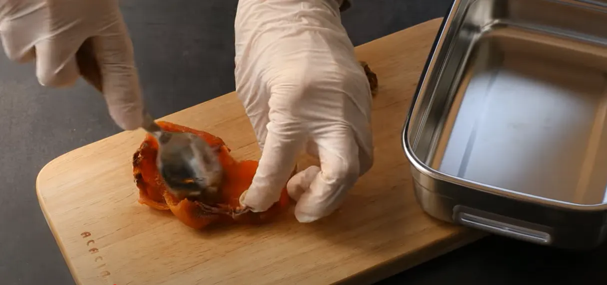 곶감은 꼭지를 제거하고 반으로 잘라 속을 파내어주세요.