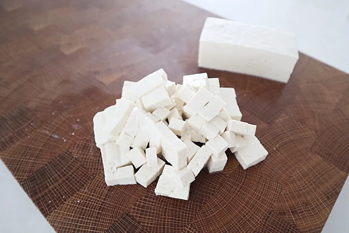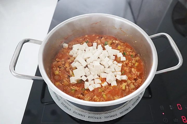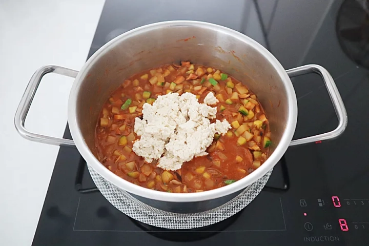 고춧가루 넣고 바글바글 끓으면 두부를 넣어주세요.