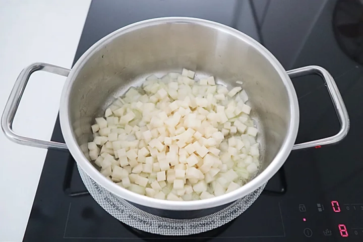 양파가 투명해지면 감자를 넣고 볶아주세요,