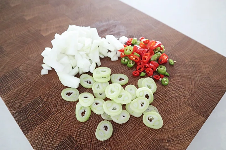 양파는 잘게 썰고 고추와 대파는 송송 썰어주세요.