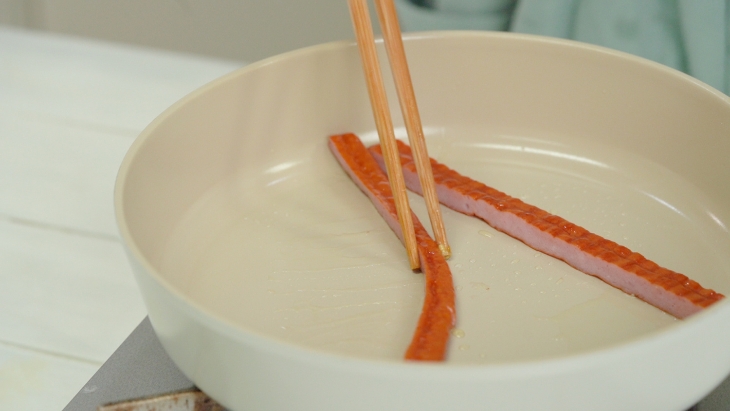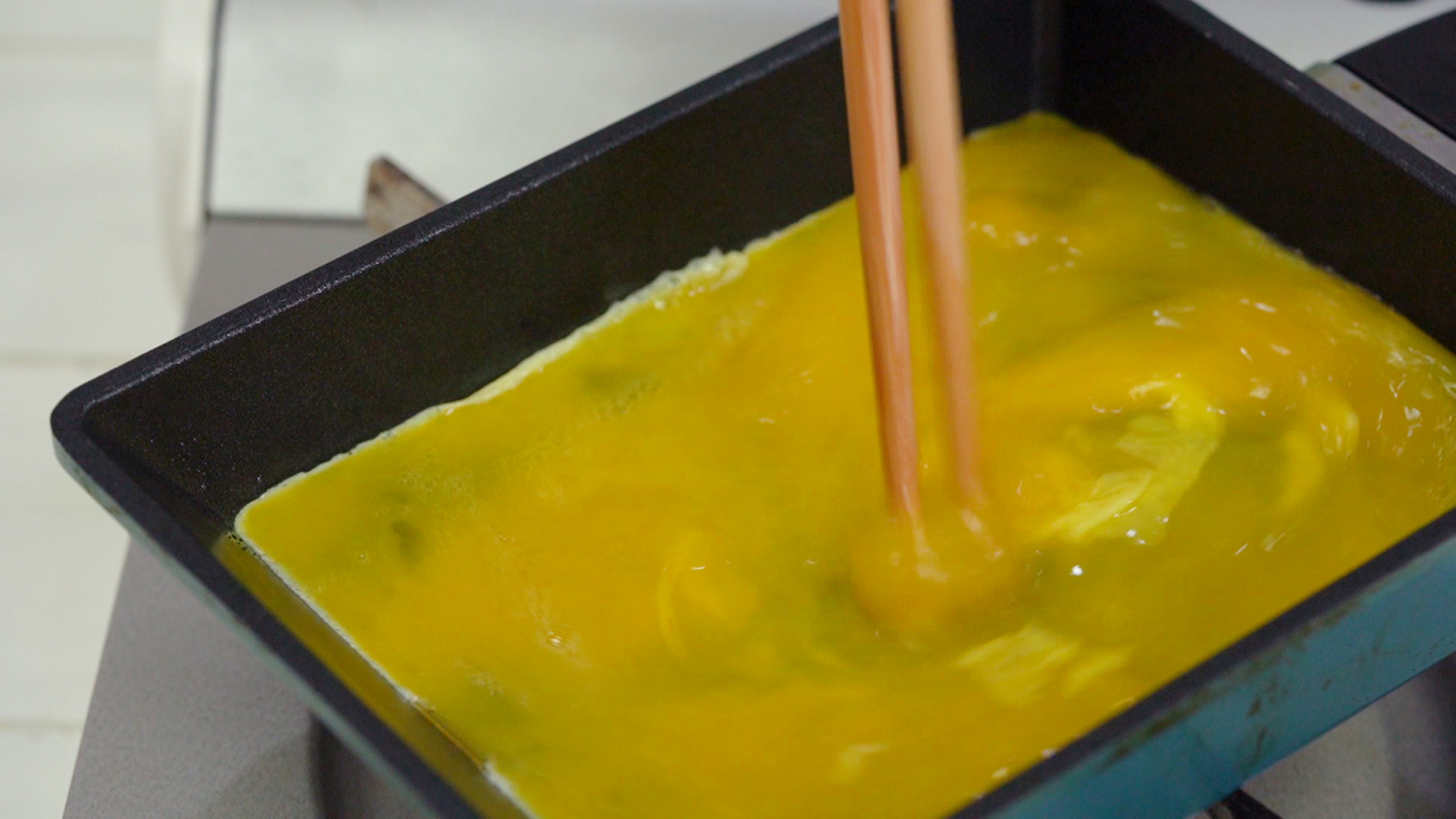 중불로 달군 팬에 식용유를 두르고 달걀물을 부어