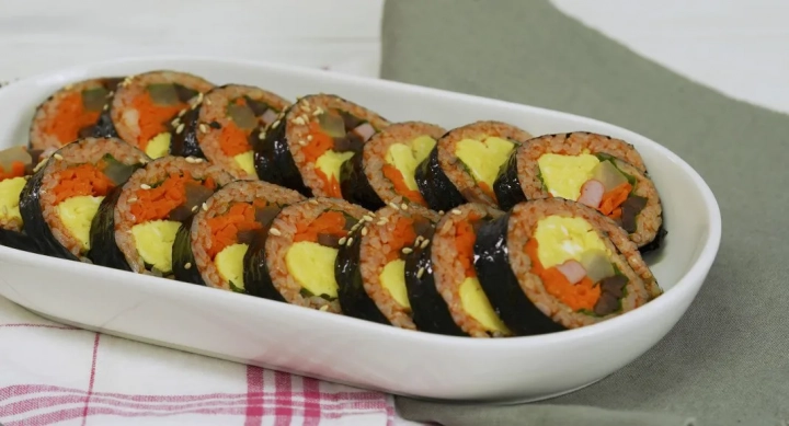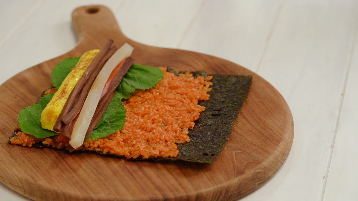 김 위에 고추장밥, 깻잎, 단무지, 햄,