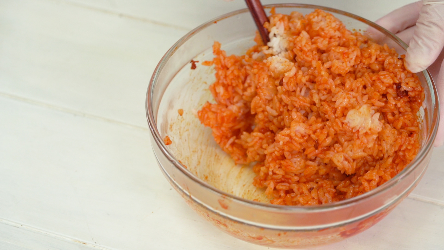 뜨거운 밥에 약고추장과 참기름을 섞어 골고루 비벼 한김 식혀주세요.