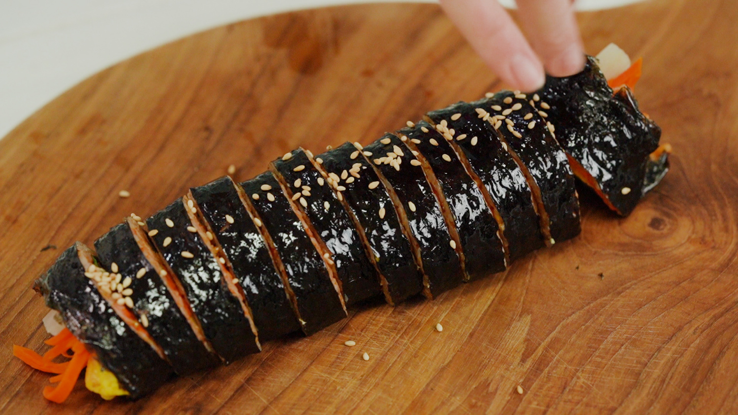 겉면에 참기름을 바르고 먹기 좋게 썬 뒤 참깨를 뿌려주면 완성~