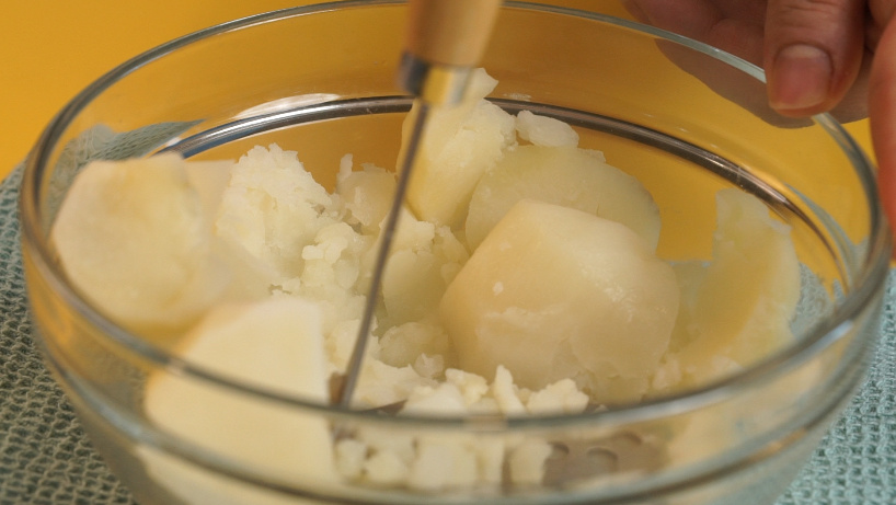 감자를 으깨고 전분 3큰술, 소금 약간을 넣고 섞어주세요.