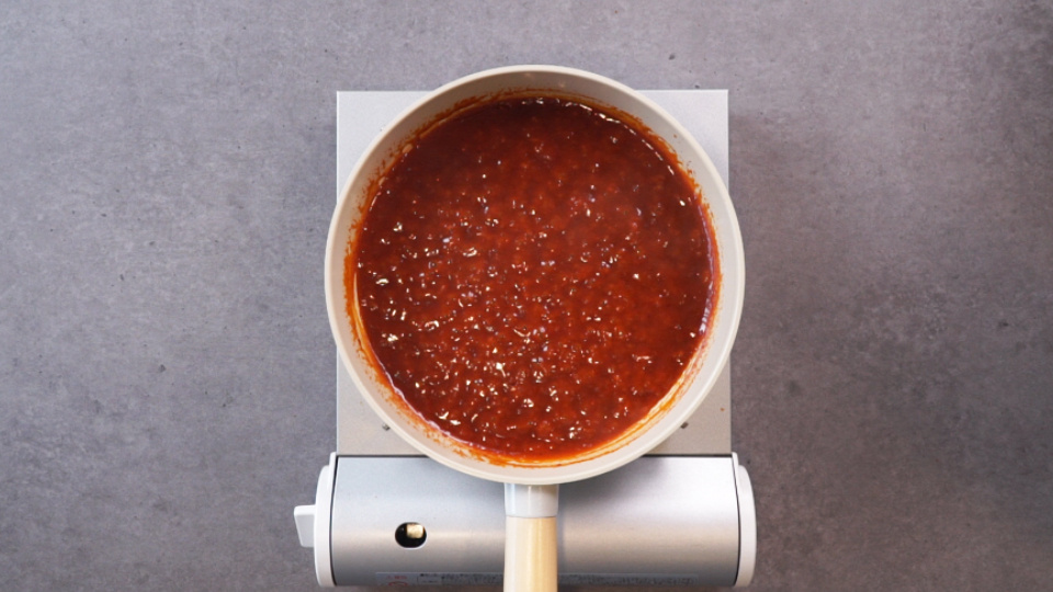 팬에 양념재료를 모두 넣고 살짝 끓여 소스를 만들어주세요.