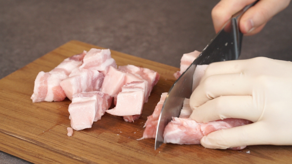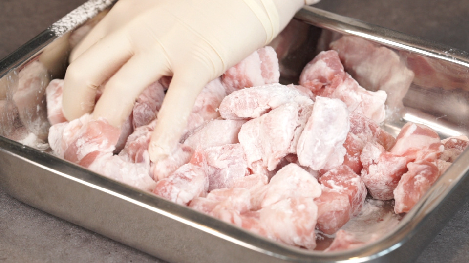 자른 삼겹살에 전분가루를 넣어 골고루 묻혀주세요.