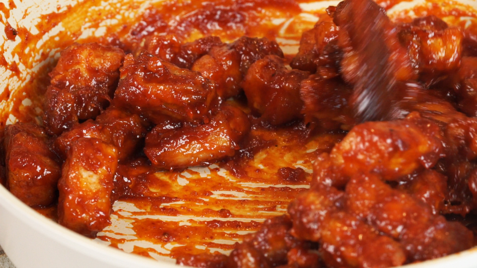 끓여진 양념소스에 구워진 삼겹살을 넣고 뒤적여
