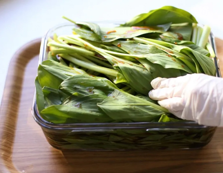 [재료]: 명이나물 1kg, 물 1L, 양조간장 800ml,