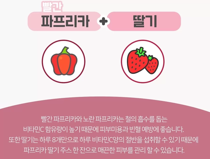 붉은 파프리카와 딸기가 만나면 풍부한 비타민C로 감기 예방에 좋은 주스가 만들어 진다고 하는데요. 비타민C가 특히 많은 붉은 파프리카에는 카로틴도 풍부하여 감기예방은 물론 피부미용에도 아주 좋다고 합니다.