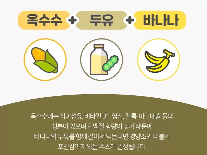 옥수수와 바나나는 당질이 풍부하고 빠르게 에너지원이 되어 아침식사 대용으로도 아주 훌륭한 주스라고 합니다.