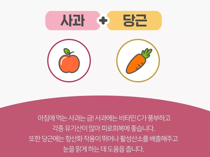'아침에 먹는 사과는 금'이라는 말 한번쯤 들어보신적 있으시죠? 사과에는 비타민C가 풍부하고 각종 유기산이 많아 피로회복에 좋다고 하는데요. 또한 당근에는 항산화작용이 뛰어나 활성산소를 배출해주고 눈을 맑게 하는데 도움을 준다고 합니다.