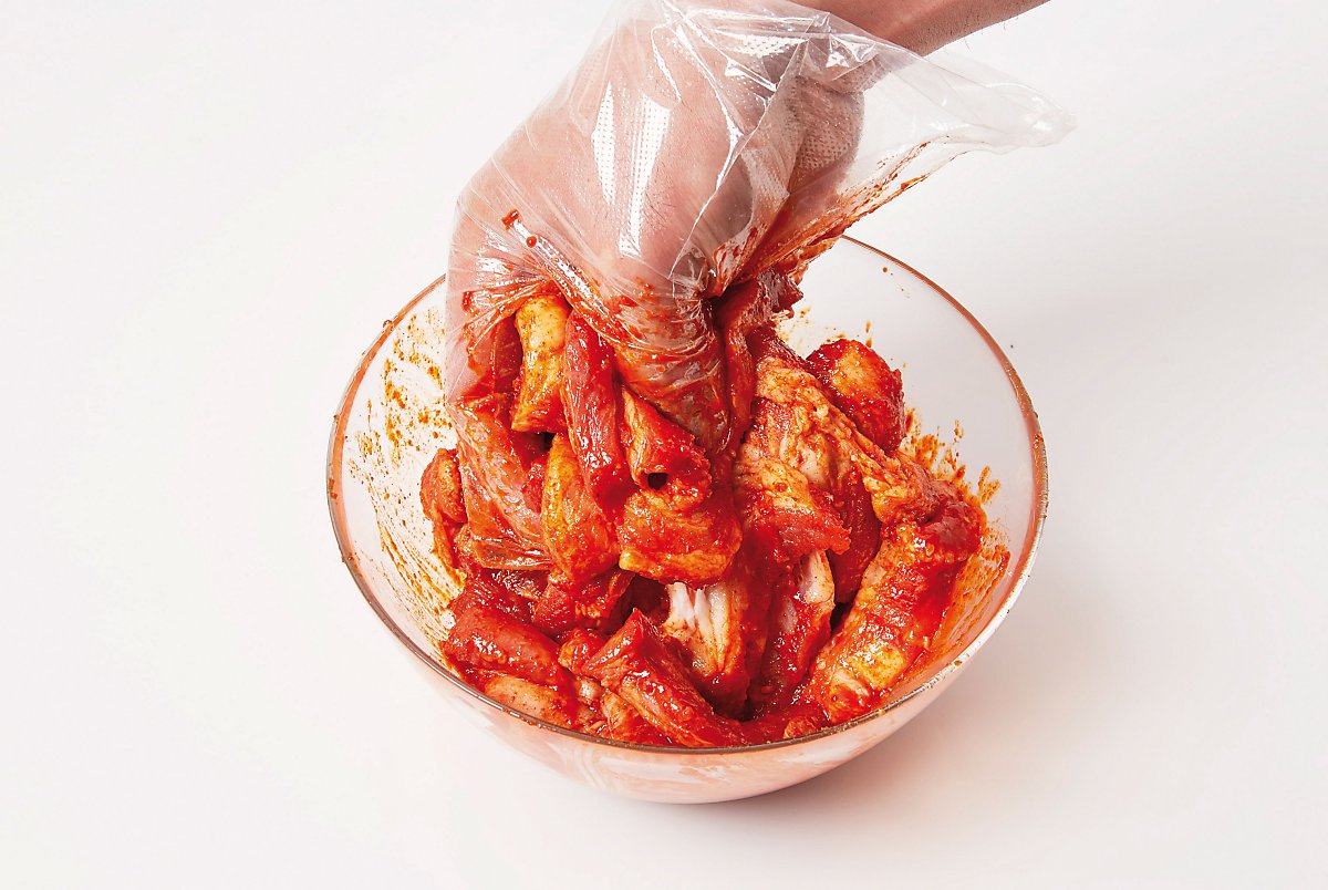 삼겹살을 넣어 버무린 뒤 밀봉해 냉장실에서 2시간 이상 숙성해주세요.