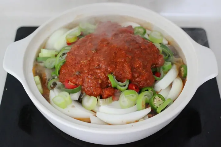 멸치육수나 쌀뜨물 1컵을 붓고 끓여주세요.