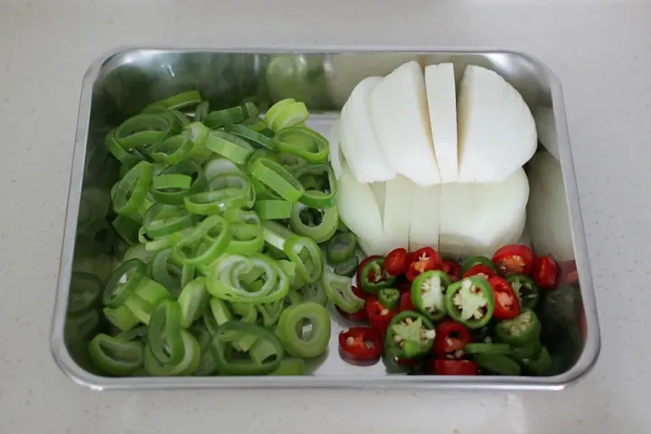 양파 1개, 청고추 1개, 홍고추 1개, 멸치육수 or 쌀뜨물