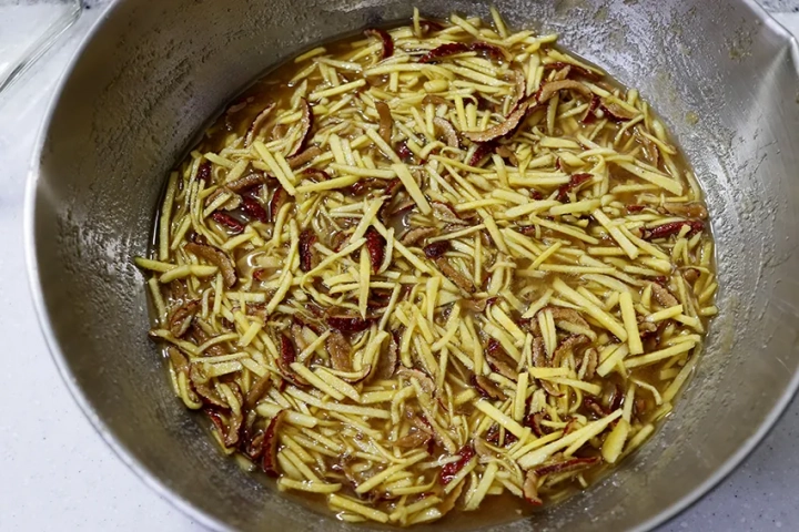 손질한 생강은 편으로 얇게 썰어준 뒤 다시 채를 썰어주세요.