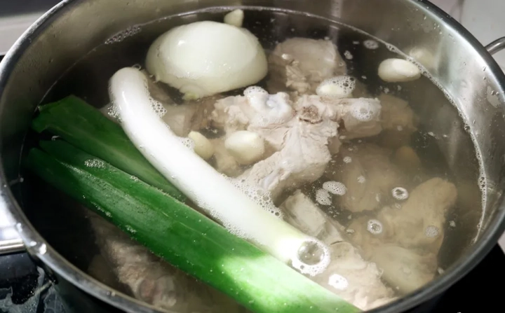 [등뼈삶기]: 양파 1/2개, 대파 1대, 통마늘 6개, 통후추 1큰술, 생강 1쪽