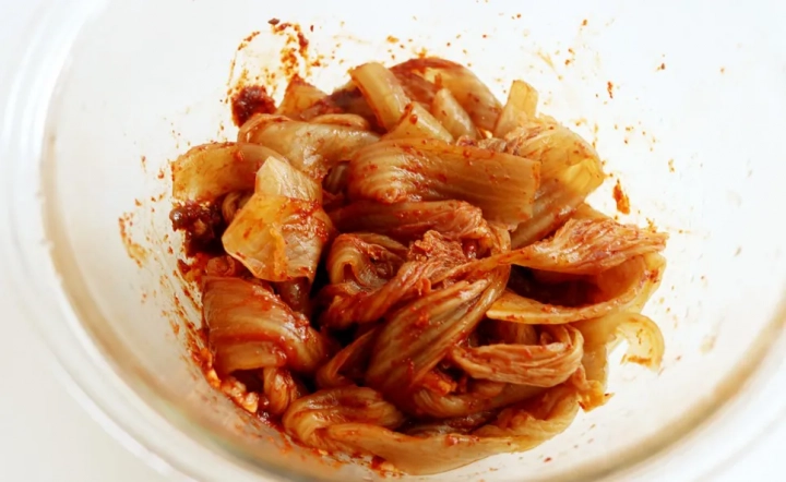 묵은지를 먹기 좋게 찢어주고 양념장의 반을 덜어서 버무려주세요.