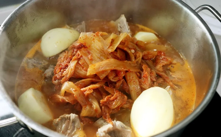 걸러낸 육수에 등뼈와 감자, 묵은지,