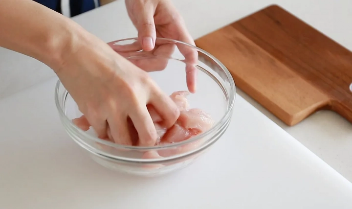 닭가슴살은 한 입 크기로 썰고 밑간재료에 버무려 밑간을 해주세요.