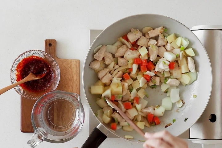 닭고기, 양파, 감자, 당근을 넣고 골고루 볶아주세요.