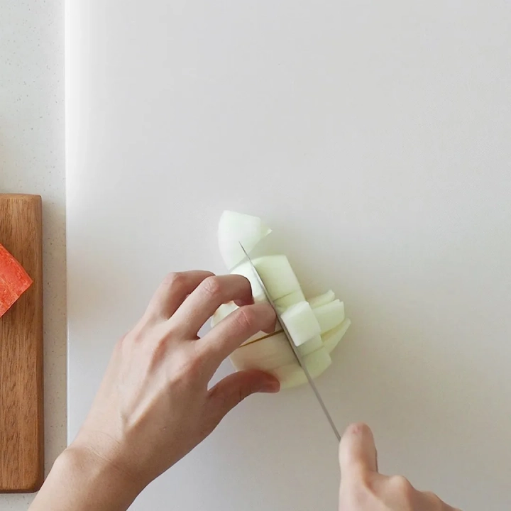 양파와 당근은 같은 크기로 깍뚝 썰기해주세요.