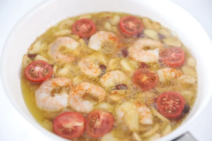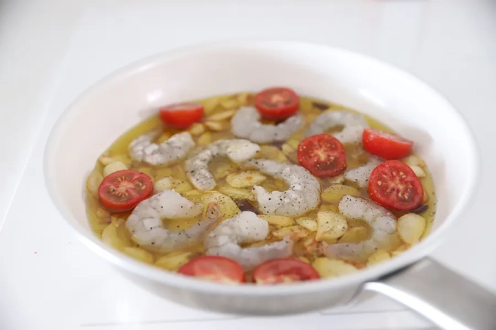 [재료]: 마늘 20알, 새우 취향껏, 방울토마토,