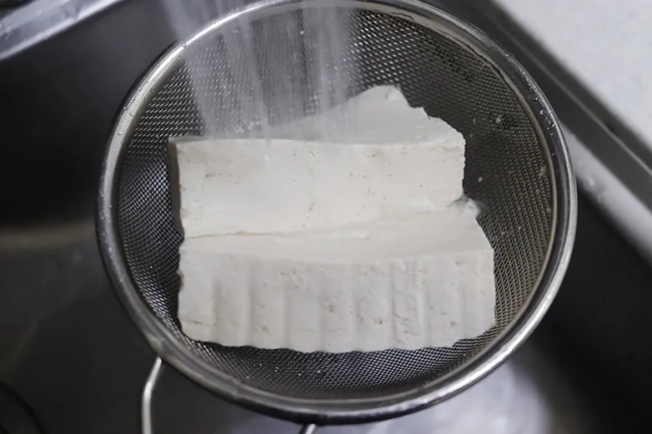 데친 두부는 체반에 받쳐 찬물에 헹구면서 식혀주세요.