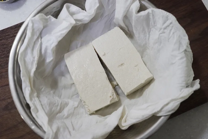물이 가득한 두부는 면보에 짜서 물기를 최대한 없애주세요.