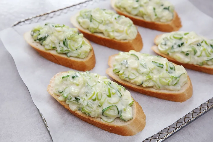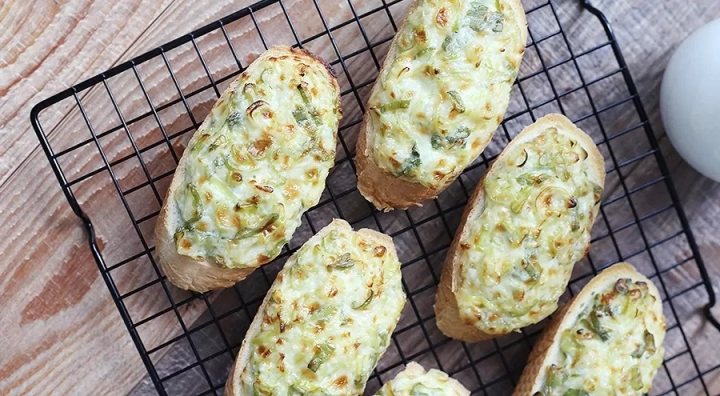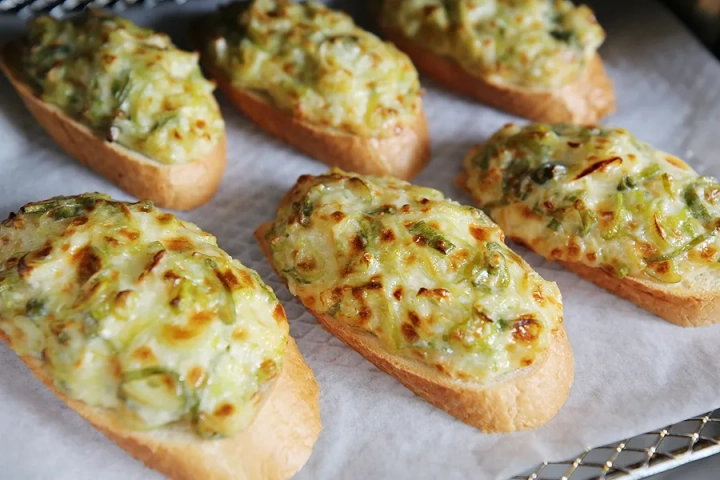 1cm 정도 두께의 바게트 빵위에 대파소스를 듬뿍 올려주세요.