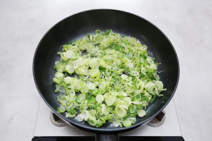 버터가 녹으면 팬에 대파를 볶아주세요.
