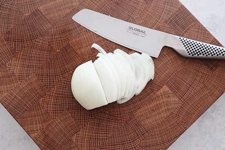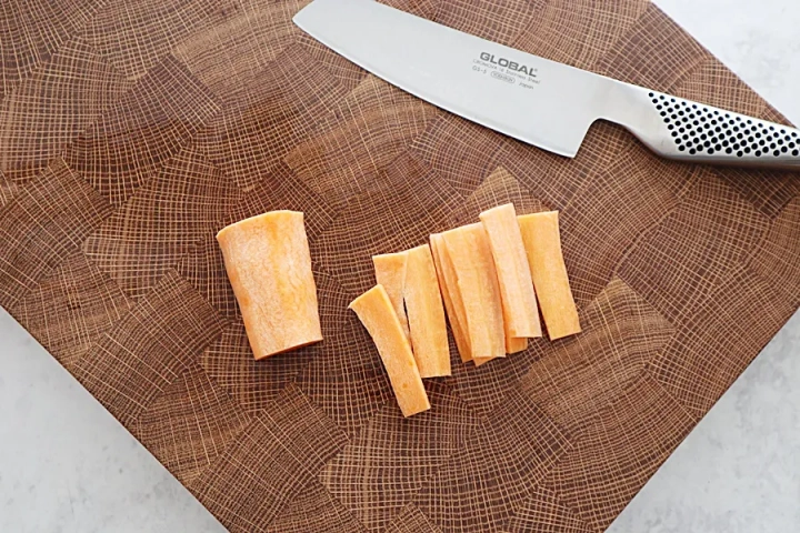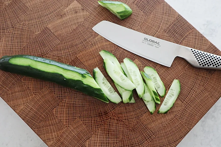 오이는 반으로 갈라 어슷하게 썰어주세요.
