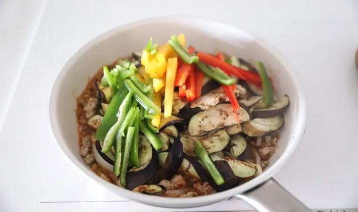 [재료]: 돼지고기다짐육 200g, 가지 2개, 피망 1/4개,