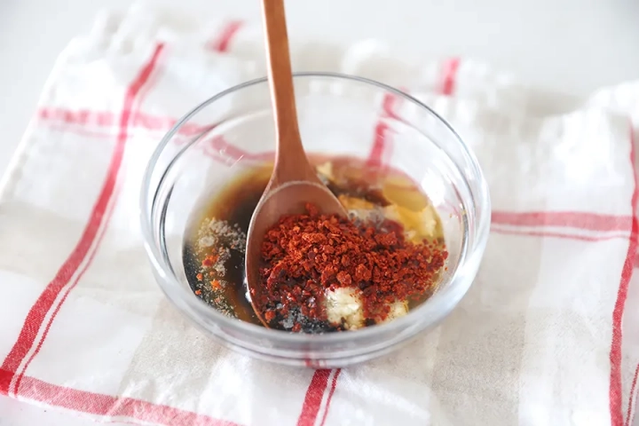 설탕 1/2큰술, 물 5큰술, 고춧가루 1큰술, 다진마늘 1/2큰술, 후추 약간