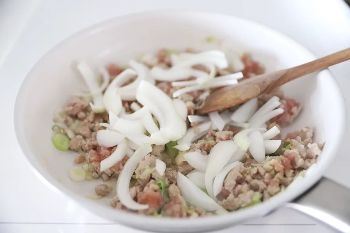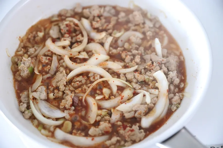 파향이 올라오면 돼지고기다짐육을 넣어 볶아주세요.