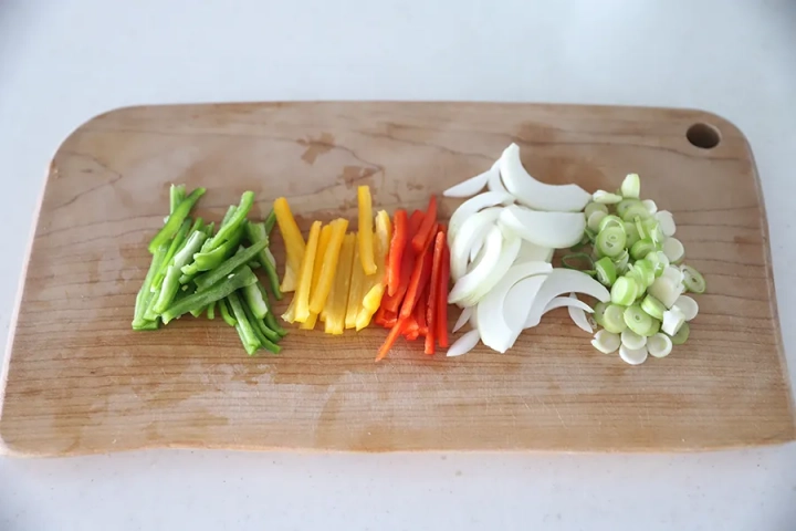 피망, 파프리카, 양파는 채를 썰고 대파는 송송 썰어주세요.