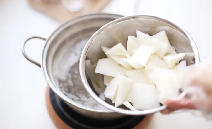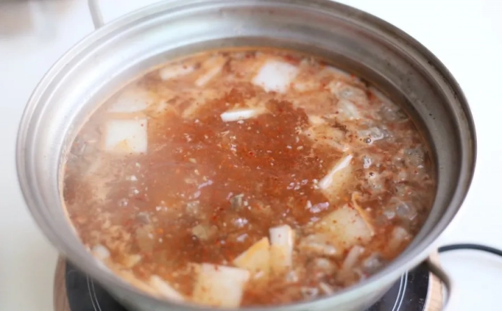 고기가 익으면 무를 넣고 뚜껑을 닫고 끓여주세요.