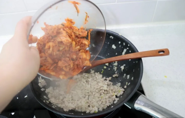 고기가 완전히 익으면서 기름기가 나오면 잘라둔 김치를 넣고 볶아주세요.