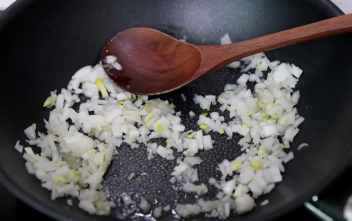 팬에 기름을 두르고 다진마늘과 양파를 볶아주세요.