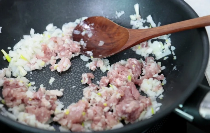 양파가 투명해지면 돼지고기다짐육을 넣고 볶아주세요.