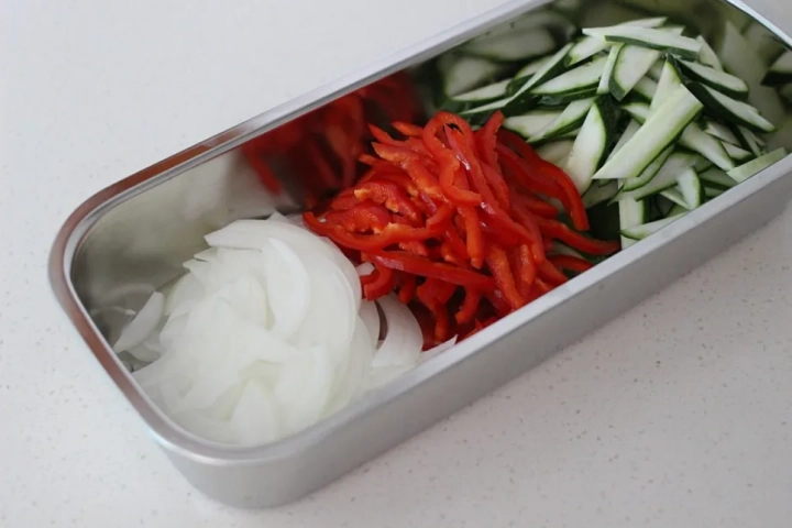 [재료]: 닭가슴살 1개, 오이 1개, 파프리카 1개,