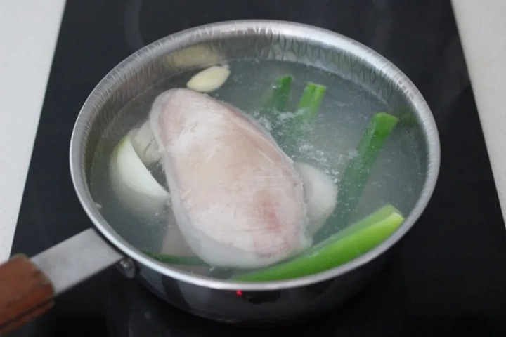 물이 끓어오르면 닭가슴살과 청주를 넣고 삶아주세요.